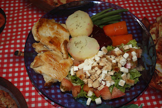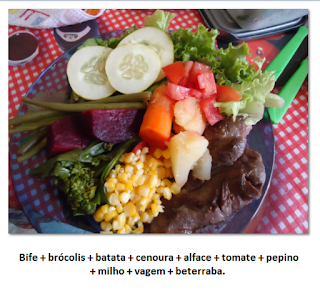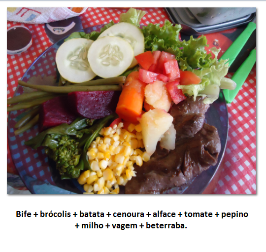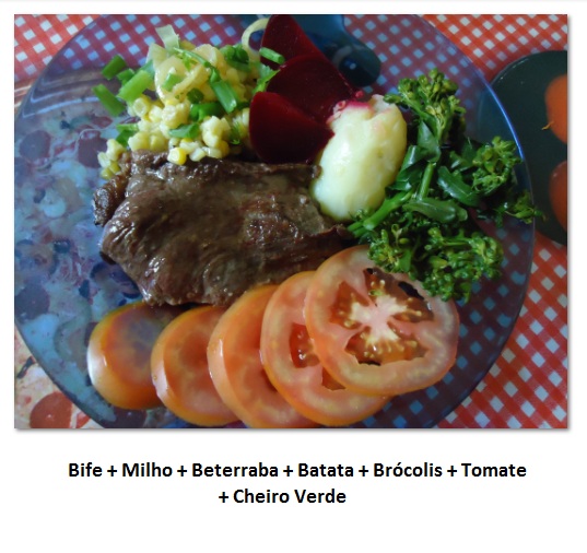 Almoço: Brócolis, tomate, cenoura ralada, beterraba, batata, frango acebolado e queijo frescal light.